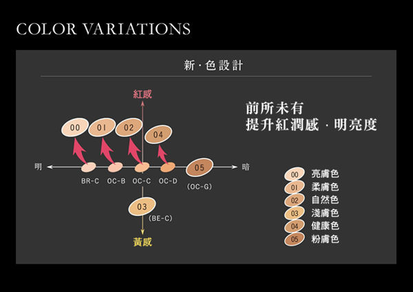 無香料,添加預防肌膚乾燥的保濕成份(水溶性膠原蛋白),上妝同時保養臉部肌膚,使肌膚水潤不乾燥。全新色調設計,讓整體氣色更加紅潤明亮。 (06色號為亞洲限定販售的粉膚色。)